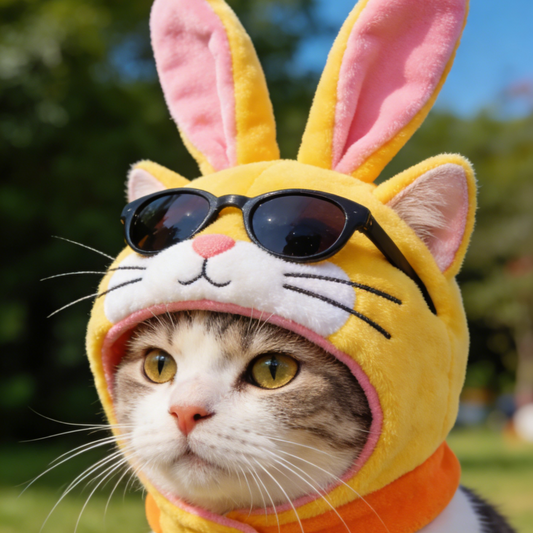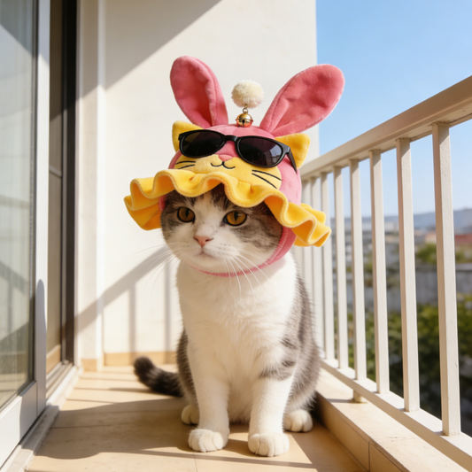 Cool Bunny Cat Hat with Sunglasses & Bell | Trendy Pink-Yellow Pet Costume for Cats & Small Dogs